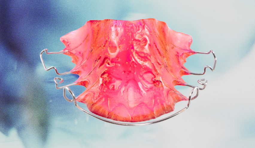 This is the most traditional type of retainer. It consists of a metal wire that runs across the front teeth and a plastic base that fits over the roof of the mouth or the lower gums.